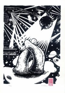 Je suis Stéphane Gétas, alias Spig / Linocutfactory. Depuis 1999, je crée un univers graphique où Musique, Nature, sciences et espace se rencontrent, avec une esthétique marquée et singulière. Toujours dans l’exploration et l’expérimentation que ce soit en linogravure, Legographie, encres, sculptures, pochoirs…
